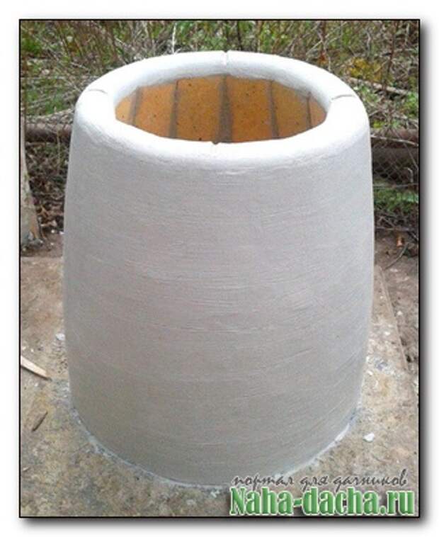 После выкладки третьего ряда начал оштукатуривать тандыр печной смесью (фото 2). Общий слой штукатурки должен быть не менее 10 мм. Верхний край конструкции сформировал в виде валика (фотоЗ). После высыхания раствора покрыл изделие акриловой огнеупорной краской. Когда раствор окончательно высох, очистил внутреннее пространство тандыра от наплывов, грязи.