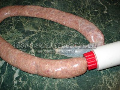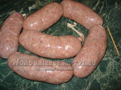 Равномерно распределяйте колбасную массу, так чтобы не было полостей, но и не очень туго. Завяжите концы и не забудьте проткнуть полуфабрикаты зубочисткой или иголочкой, чтобы при приготовлении лишняя влага и воздух имела возможность выйти, а колбасная оболочка не лопнула.