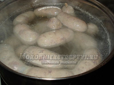 В нашем варианте колбаски сначала отваривались 20 минут в кипящей воде.