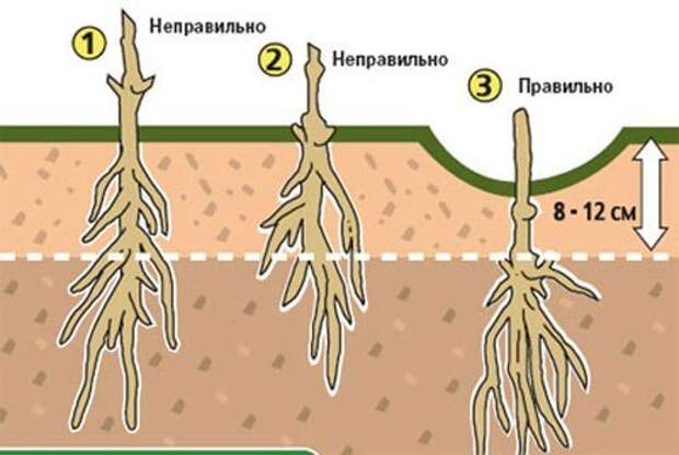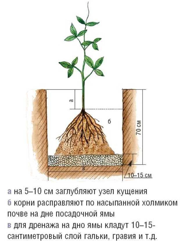 При высоком стоянии грунтовых вод (80–100 см) их сажают на искусственных холмиках, а на дне посадочных ям устраивают дренаж из гальки, гравия, битых кирпичей. На тяжелых почвах размеры посадочных ям – 70 х 70 х 70, на легких – 50 х 50 х 50.